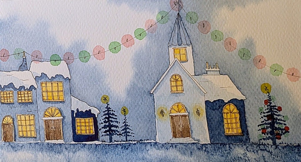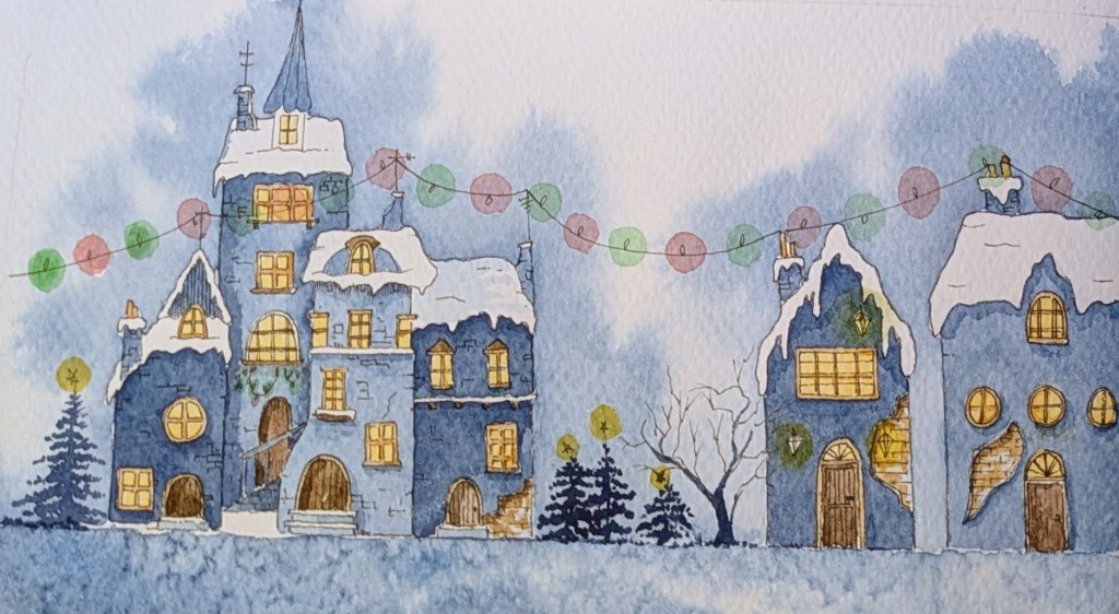The indigo settles exactly how I hoped it would: deep without being heavy, textured without shouting. It gives the scene weight and atmosphere, the kind that makes the yellow windows feel warm rather than merely bright. The snow sits where it should. The buildings hold together across the gutter without collapsing into two separate ideas. That alone feels like a small miracle.